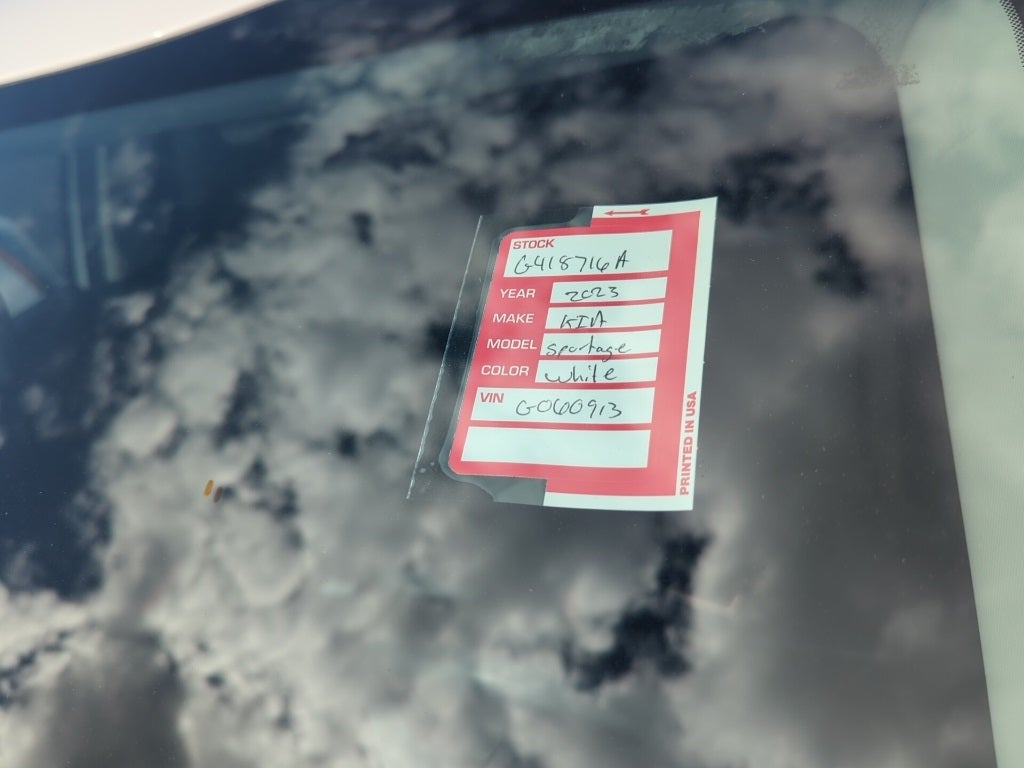 2023 Glacial White Pearl Kia Sportage EX This Kia Sportage has many features and is well equipped including, Kia Certified Pre-Owned Certified, 4-Wheel Disc Brakes, 6 Speakers, ABS brakes, Air Conditioning, Alloy wheels, AM/FM radio: SiriusXM, Apple CarPlay & Android Auto, Auto High-beam Headlights, Automatic temperature control, Axle Ratio: 3.648, Brake assist, Bumpers: body-color, Cargo Cover, Cargo Net Hybrid w/o Audio, Carpet Cargo Mat w/Seatback Protection, Carpeted Floor Mats, Compass, Delay-off headlights, Driver door bin, Driver vanity mirror, Dual front impact airbags, Dual front side impact airbags, Electronic Stability Control, Emergency communication system, Four wheel independent suspension, Front anti-roll bar, Front Bucket Seats, Front Center Armrest, Front dual zone A/C, Fully automatic headlights, Heated door mirrors, Heated Front Bucket Seats, Heated front seats, Illuminated entry, Leather Shift Knob, Leather steering wheel, Leatherette Seat Trim, Low tire pressure warning, Navigation System, Occupant sensing airbag, Outside temperature display, Overhead airbag, Overhead console, Panic alarm, Passenger door bin, Passenger vanity mirror, Power door mirrors, Power driver seat, Power steering, Power windows, Radio: AM/FM/HD Audio System, Rain sensing wipers, Rear anti-roll bar, Rear seat center armrest, Rear window defroster, Rear window wiper, Remote keyless entry, Security system, Speed control, Speed-sensing steering, Split folding rear seat, Spoiler, Steering wheel mounted audio controls, Tachometer, Telescoping steering wheel, Tilt steering wheel, Traction control, Trip computer, Turn signal indicator mirrors, Variably intermittent wipers, Wheels: 18 Machine Finish Alloy.