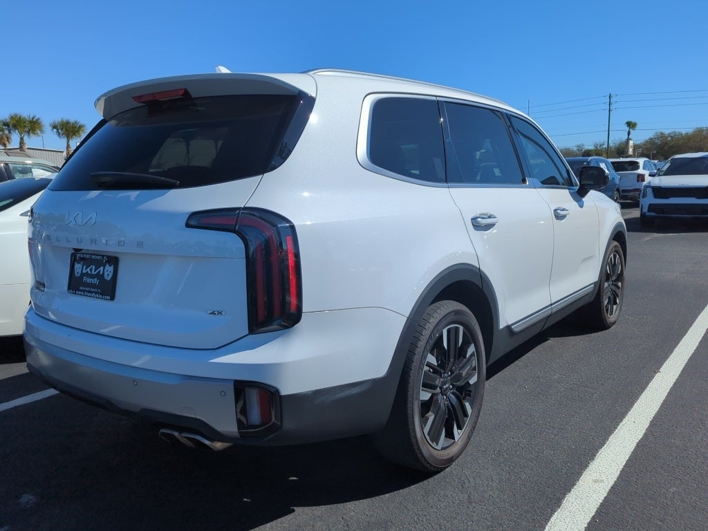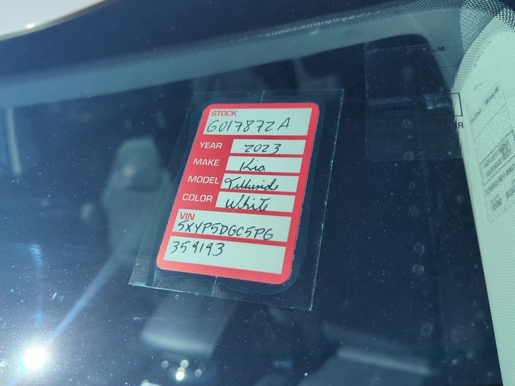 2023 Glacial White Pearl Kia Telluride SX This Kia Telluride has many features and is well equipped including, Kia Certified Pre-Owned Certified, 10 Speakers, 3.648 Axle Ratio, 3rd row seats: split-bench, 4-Wheel Disc Brakes, ABS brakes, Air Conditioning, Alloy wheels, AM/FM radio: SiriusXM, Apple CarPlay & Android Auto, Auto High-beam Headlights, Auto-dimming Rear-View mirror, Automatic temperature control, Brake assist, Bumpers: body-color, Carpet Floor Mats, Compass, Delay-off headlights, Driver door bin, Driver vanity mirror, Dual front impact airbags, Dual front side impact airbags, Electronic Stability Control, Emergency communication system: 911 Connect, Exterior Parking Camera Rear, Four wheel independent suspension, Front anti-roll bar, Front Bucket Seats, Front Center Armrest, Front dual zone A/C, Front fog lights, Front reading lights, Fully automatic headlights, Garage door transmitter: HomeLink, harman/kardon® Speakers, Heated & Ventilated Front Bucket Seats, Heated door mirrors, Heated front seats, Heated steering wheel, Illuminated entry, Knee airbag, Leather Seat Trim, Leather Shift Knob, Leather steering wheel, Low tire pressure warning, Memory seat, Navigation System, Occupant sensing airbag, Outside temperature display, Overhead airbag, Overhead console, Panic alarm, Passenger door bin, Passenger vanity mirror, Power door mirrors, Power driver seat, Power Liftgate, Power moonroof, Power passenger seat, Power steering, Power windows, Radio data system, Radio: AM/FM harman/kardon Audio System, Rear air conditioning, Rear anti-roll bar, Rear audio controls, Rear reading lights, Rear side impact airbag, Rear window defroster, Rear window wiper, Reclining 3rd row seat, Remote keyless entry, Roof rack: rails only, Security system, Smart Key w/ Push Button and Remote Start, Speed control, Speed-sensing steering, Split folding rear seat, Spoiler, Steering wheel mounted audio controls, Tachometer, Telescoping steering wheel, Tilt steering wheel, Traction control, Trip computer, Turn signal indicator mirrors, Variably intermittent wipers, Ventilated front seats, Wheels: 20 x 7.5 Black Finish.