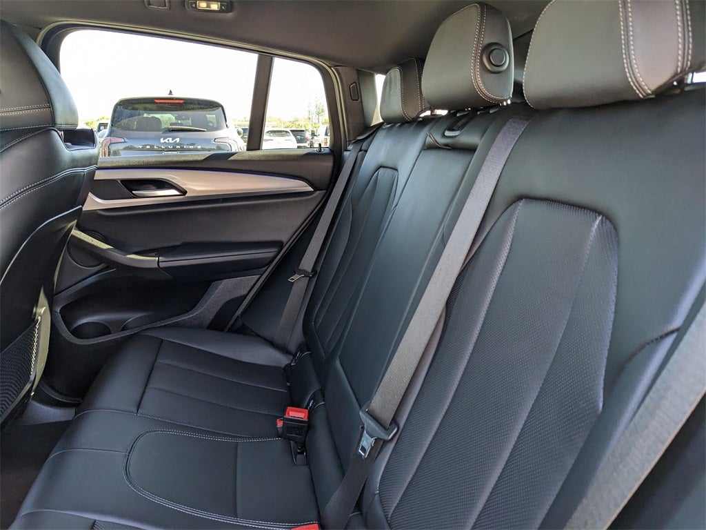 2025 Black BMW X4 xDrive30i This BMW X4 has many features and is well equipped including, 12 Speakers, 4-Wheel Disc Brakes, ABS brakes, Air Conditioning, Alloy wheels, AM/FM radio: SiriusXM, Anti-whiplash front head restraints, Apple CarPlay & Android Auto Compatibility, Auto High-beam Headlights, Auto-dimming door mirrors, Auto-dimming Rear-View mirror, Automatic temperature control, BMW Assist eCall, BMW TeleServices, Brake assist, Bumpers: body-color, Connected Package Pro, ConnectedDrive Services, Delay-off headlights, Driver door bin, Driver vanity mirror, Dual front impact airbags, Dual front side impact airbags, Electronic Stability Control, Emergency communication system: BMW Assist eCall, Enhanced USB & Bluetooth® w/Smartphone Integration, Exterior Parking Camera Rear, Four wheel independent suspension, Front anti-roll bar, Front Bucket Seats, Front Center Armrest, Front dual zone A/C, Front reading lights, Fully automatic headlights, Garage door transmitter, Genuine wood dashboard insert, Genuine wood door panel insert, Heated door mirrors, Heated Front Seats, Heated front seats, Hi-Fi Sound System, Illuminated entry, Knee airbag, Leather steering wheel, Live Cockpit Pro w/Navi, Low tire pressure warning, Memory seat, Navigation System, Occupant sensing airbag, Outside temperature display, Overhead airbag, Overhead console, Panic alarm, Passenger door bin, Passenger vanity mirror, Perforated SensaTec Upholstery, Power door mirrors, Power driver seat, Power Front Seats, Power Liftgate, Power moonroof, Power passenger seat, Power steering, Power windows, Radio data system, Radio: AM/FM Audio System, Rain sensing wipers, Rear air conditioning, Rear anti-roll bar, Rear reading lights, Rear seat center armrest, Rear window defroster, Remote keyless entry, Security system, SiriusXM Satellite Radio w/1 Year Subscription, Speed control, Speed-sensing steering, Speed-Sensitive Wipers, Split folding rear seat, Sport Seats, Sport steering wheel, Steering wheel mounted audio controls, Tachometer, Telescoping steering wheel, Tilt steering wheel, Traction control, Trip computer, Turn signal indicator mirrors, Variably intermittent wipers, Wheels: 19 x 7.5 Y-Spoke (Style 693), WiFi Hotspot.